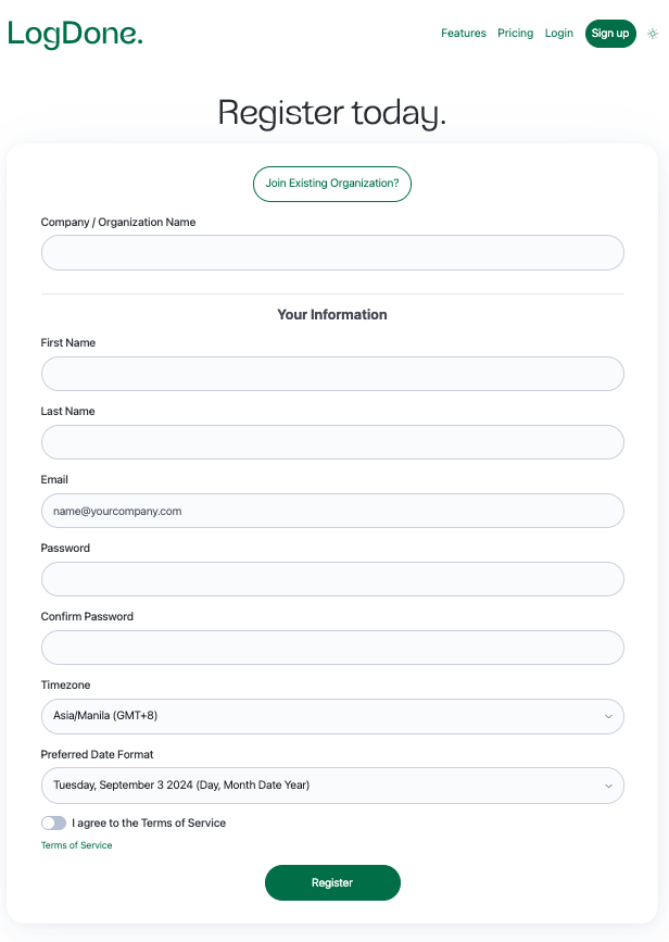 Is your team already on LogDone? Be sure to click on Join Existing Organization and type in your company / organization name.